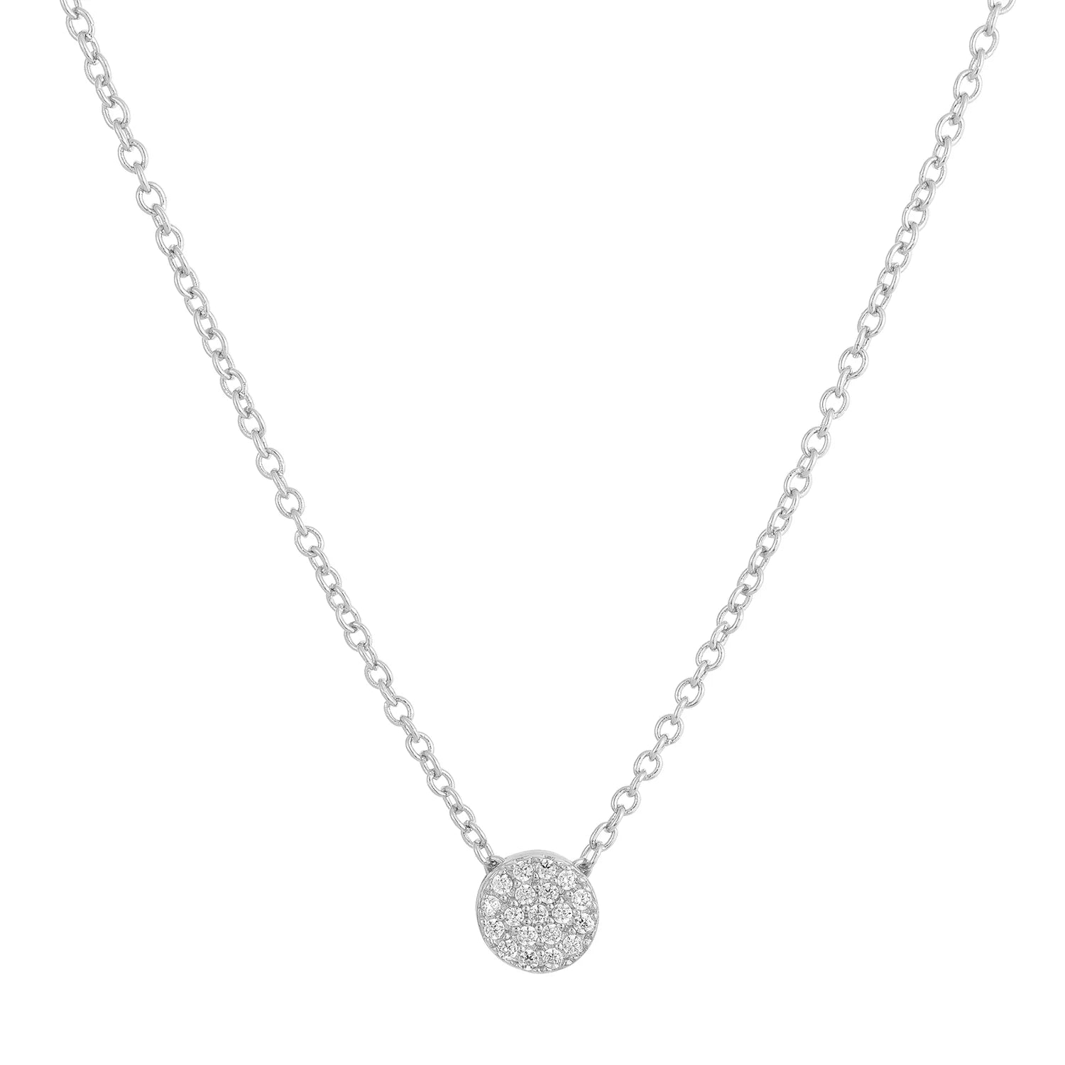 Glittering brilliant round-cut cz stones set perfectly on a round circle disc necklace. Get this for the endless shine and shimmer!
